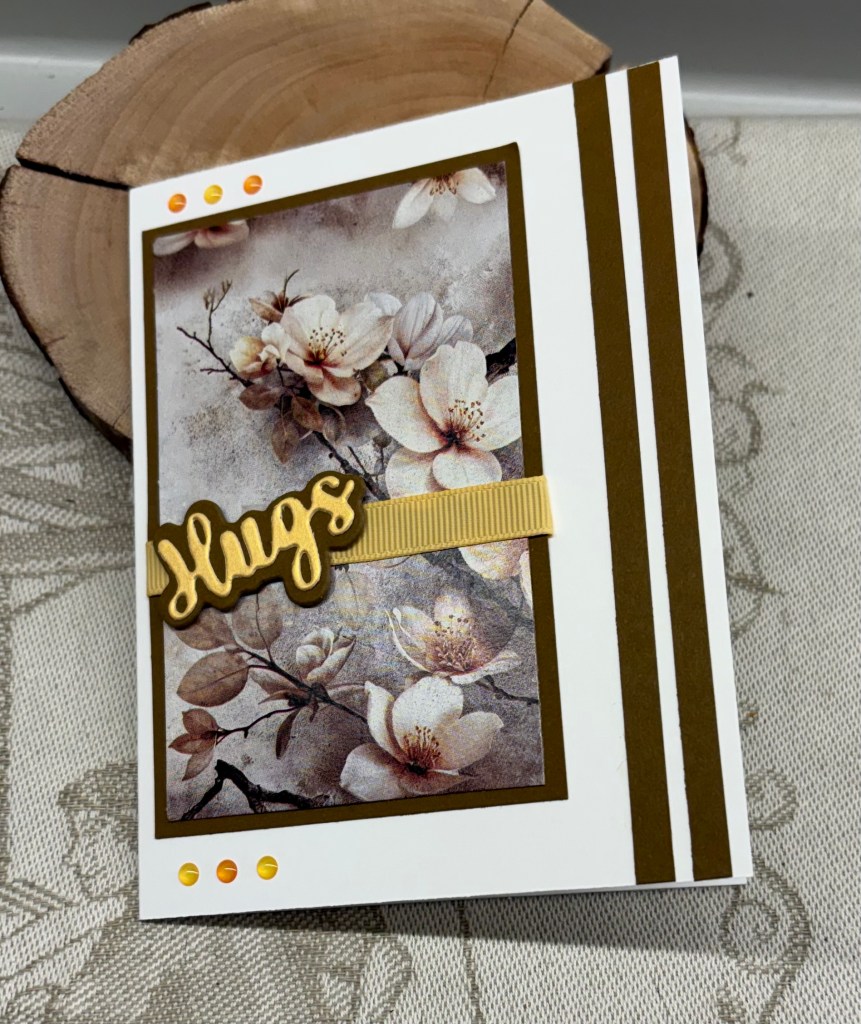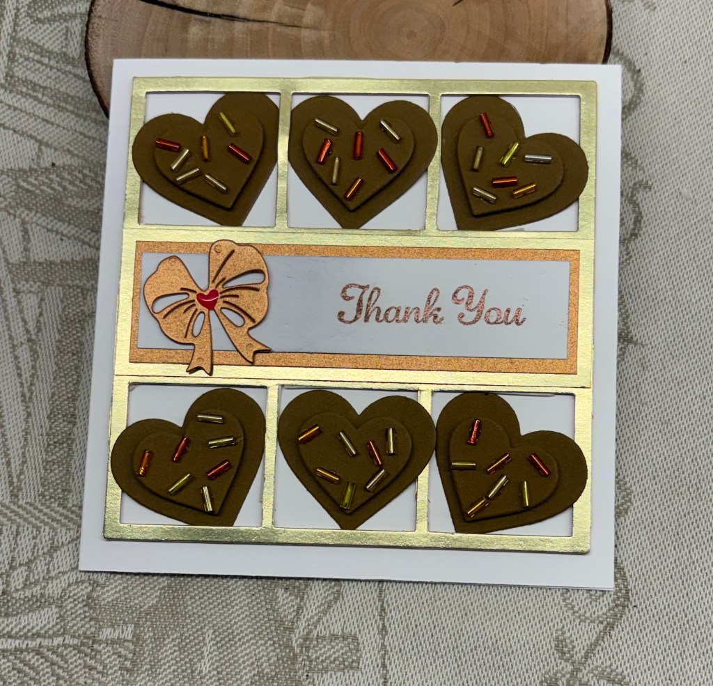 I thought about making a heart chocolate box, but decided I preferred a square box so I used a window frame (no idea of the brand) to die cut my piece and added foam tape to the back for dimension. In retrospect, it would have been easier to die cut several layers and glue them together, but we live and learn and it is something to note for next time. After cutting a 5″x5″ card front I added the window piece to it and then I carefully added the chocolates, tucking them in as best I could. For my center and sentiment I die cut a gold piece that fit across the entire frame and added a smaller copper piece, it matches some of the sprinkle colours, and then cut another white piece for that. I stamped the words and using some copper coloured Recollections EB I heat set it. An unbranded bow die set was used to cut a bow in copper and to this I added a tiny StampinUp heart embellishment. The white piece was a bit too white so I used an inking sponge with Lost Shadow ink to soften it. All in all, I’m very pleased with the result and my hubby is thrilled as he is going to be giving it to our nurse practitioner when he sees her later this week. She deserves this thank you, as she was the one who did her due diligence and got him checked out. We feel that the outcome could have been an unwanted and serious heart attack as we had no idea that it was his heart giving him trouble.