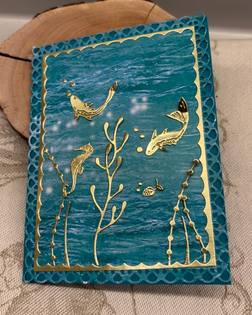 When searching for PP related to photography last month, I came across another design pad that was all about water so I bought it as well. I found this pattern in the pad and die cut it using an unbranded set. I did the same thing using one of the smaller dies and gold CS but only used the leftover piece for this card. With other bits of the gold CS I die cut the sea weeds using a Memory Box die. The tiny fish are from Gummiapan and the seahorse I can’t remember unfortunately. All the tiny gold bubbles are fallouts from the Memory Box die cut.