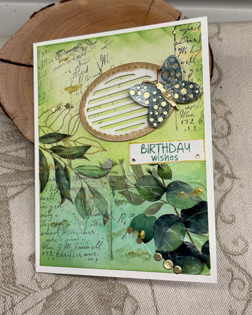 First I started with a white base panel and using Bundled Sage, Mowed Lawn and Pine Needles Distress Oxides I inked up the panel. An old wooden block stamp was used to add some writing in a couple of places I had some pretty tissue paper lying around so I chose a couple of sections and using ModgePodge I added them as you see. I spattered some Nuvo Drops that I had watered down to get some additional gold on the background. Then using a new slatted oval die set from CraftAddictions I cut the middle sized oval and went around it with some gold. After adding some foam tape around the back I placed it on a slight angle. Using a Scrapbook.com butterfly die I cut a backing piece from gold and the patterned section from a Xmas card I saved. After adding the two together I cut a body from a more metallic gold and glued it on and then glued the butterfly to the slatted oval. I had a few fall outs from a previous session and I used them as more embellishments in several places. The sentiment is from an unbranded stamp set and I used a gold pen around the edges before gluing it down. I did darken the panel’s edges before gluing it to the card front.