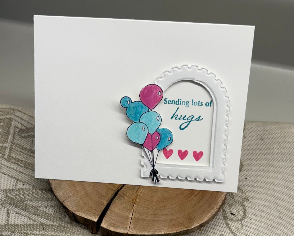 I have a few new supplies, one of which is from Spellbinders and is an EF as well as a die. I tested it out when it arrived and had this piece on my desk. Then today other new supplies arrived and the balloons are from a Simple Stories stamp set. I coloured with pencils and fussy cut them. The sentiment is from a Crafters Companion set and the hearts are from Scrapbook.com.