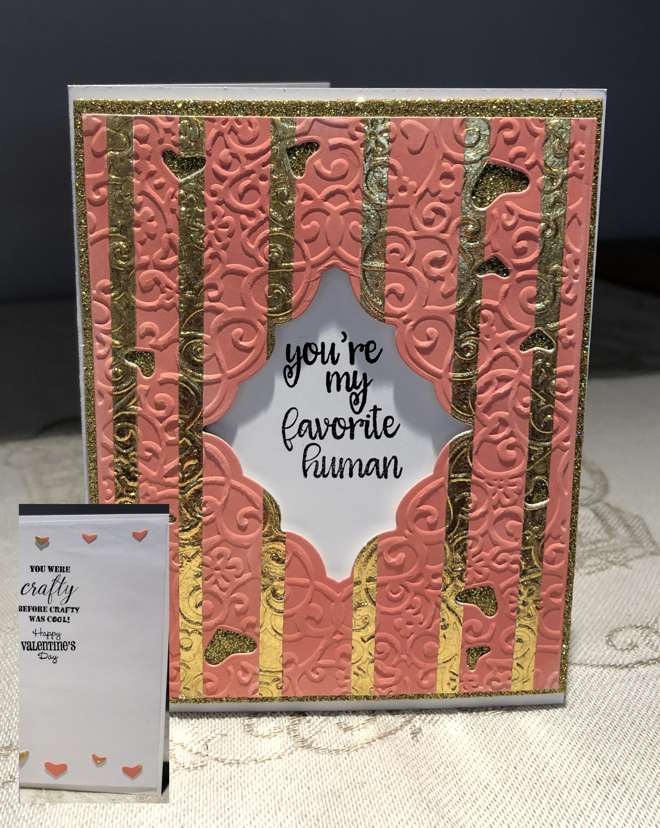 This is basically the same idea as the Striped Valentine but I used a Crafters Companion emboss /die cut as well. First I added the tape for where I wanted the foiled stripes to be, then I brush inked the entire panel with Abandoned Coral ink. Peeled off the backing from the ScorTape, added the gold foil and burnished until stuck on. Peeled off excess. Used a foam glitter piece to mount the front, so I had some glittery hearts, but cut out a portion so I had room for sentiment in middle section. Stamped sentiment and then glued whole panel to card front. I used the tiny leftover hearts to decorate the inside and finally figured out how to put 2 photos into one so you can see the inside at bottom left. Stamps used were Art from the Heart, Wreath Builder from GKD and the valentine stamp is from a Simon Says set. Can’t believe this is the only Valentine sentiment stamp I have, so I must get one or two more.
