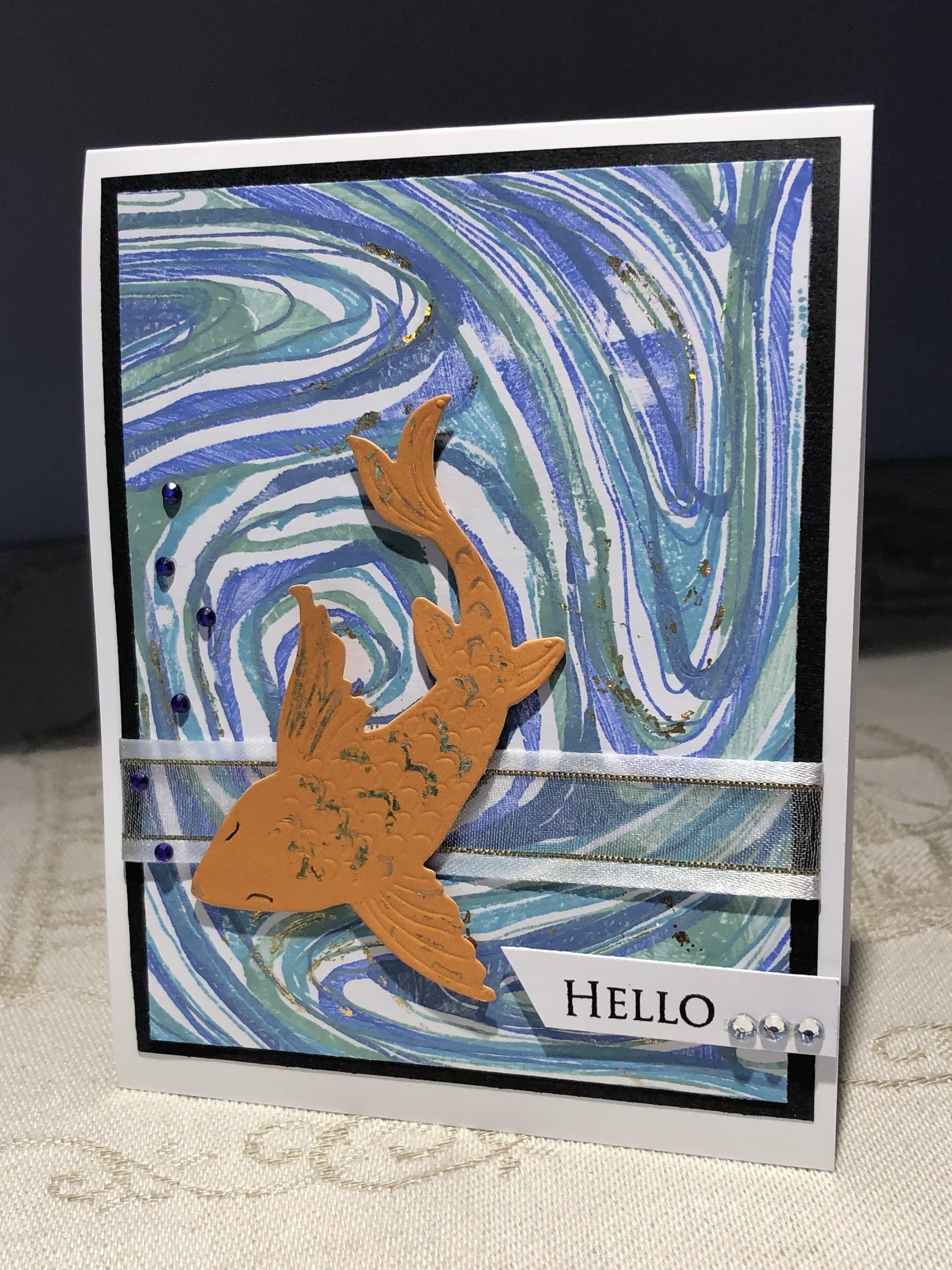 Added some Gina K ribbon about two thirds down and then added the Koi die cut on top. I also used the same foiling technique on him for added interest. Added some tiny gems for bubbles and a sentiment hello. Decided to enter it into the following challenge even though it doesn’t follow the sketch exactly: