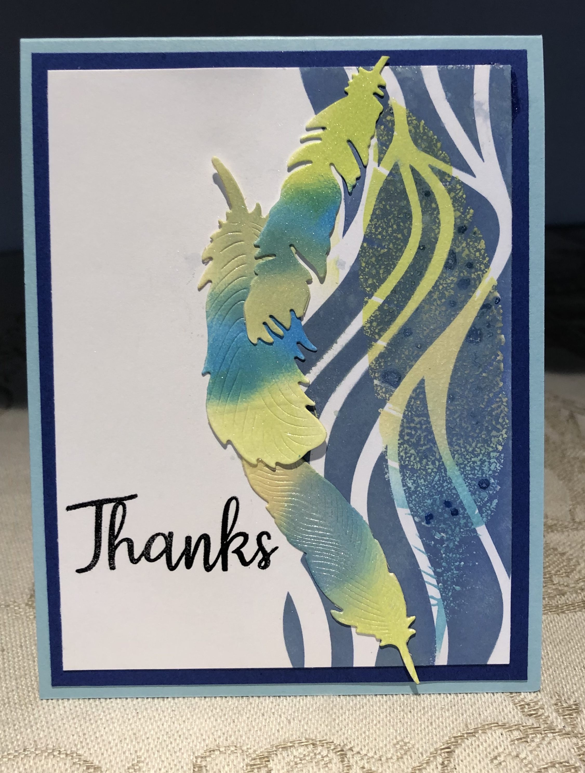 Using some feather dies I cut out the feathers and sponged colour on with distress inks. I then added some perfect pearls for some shimmer. Any spots you see are from the perfect pearls. I adhered the feathers along the wave edge and added the sentiment from a Simon Says set. Added the entire piece to some darker blue card stock and then to the Ocean Mist card front.
