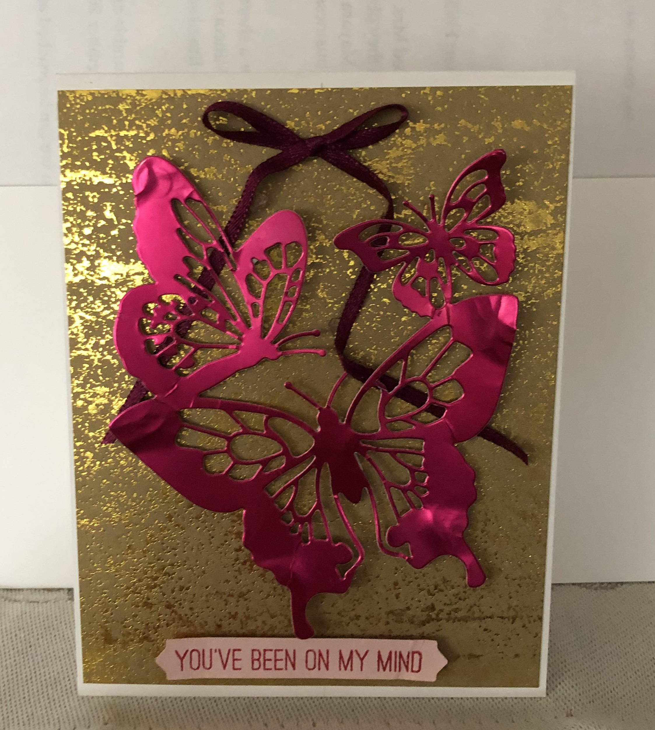 This past week I’ve made 3 items ready to post but didn’t have the opportunity to actually post them. Basically this one was just using up the foiled butterflies which I took off another card. I think they came from StampinUp but I’m not sure.