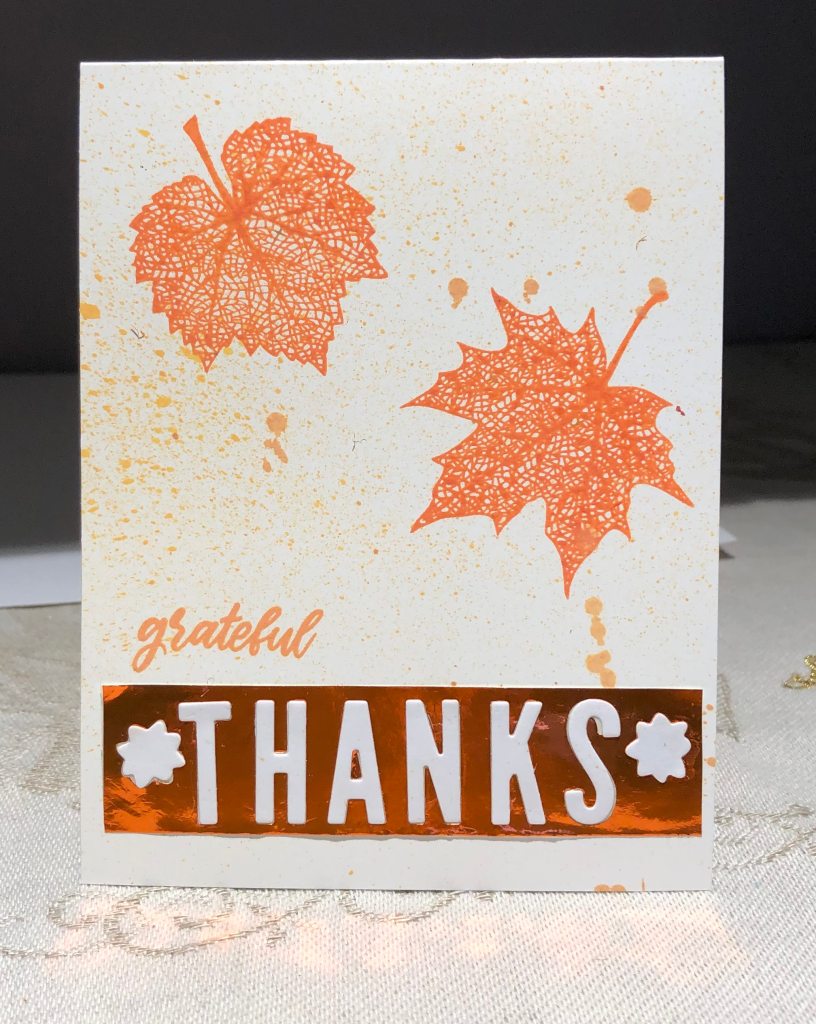 Using the skeleton leaf set from GKD I stamped two of the larger leaves in Ripe Persimmon. I also stamped the word grateful in Spice Marmalade. Using the same inks I placed some on my craft mat and sprayed it with water so I could get it onto a wet brush and gently sprinkle over the top. When dry I added the paper pieced thanks to the bottom. The die is from a Concord and 9th turnabout set I purchased.
