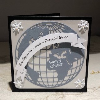 The Paper Players wanted something New, Sunday Stamps – Stay Neutral and Jugs was a theme Word Snowflakes. I’ve had the world die from Sissix for a long time but couldn’t use it a lot as it wouldn’t cut well on my Big Shot. On the Gemini it was a different story and it cut beautifully. I used one of the gray tones as close a match as possible to the Neutral colour challenge and adhered it another gray silvery piece and then onto black. With the white sentiment banner and the stamped sentiment I covered off 3 colours. Before gluing to the base I used a corner punch to round off the corners and punched small holes so I could add the snowflake brads at each corner. The banner was created on my computer as I didn’t have any sentiments that would work, so created my own, and didn’t have the right shaped banner die either. I fussy cut this out and popped it on top of the world. Added the winter sentiment because inside it says ‘It is snowing somewhere in the world right now’. I also added some iridescent gems to the center of the brads for a bit of bling. i’m really happy with how this one turned out.