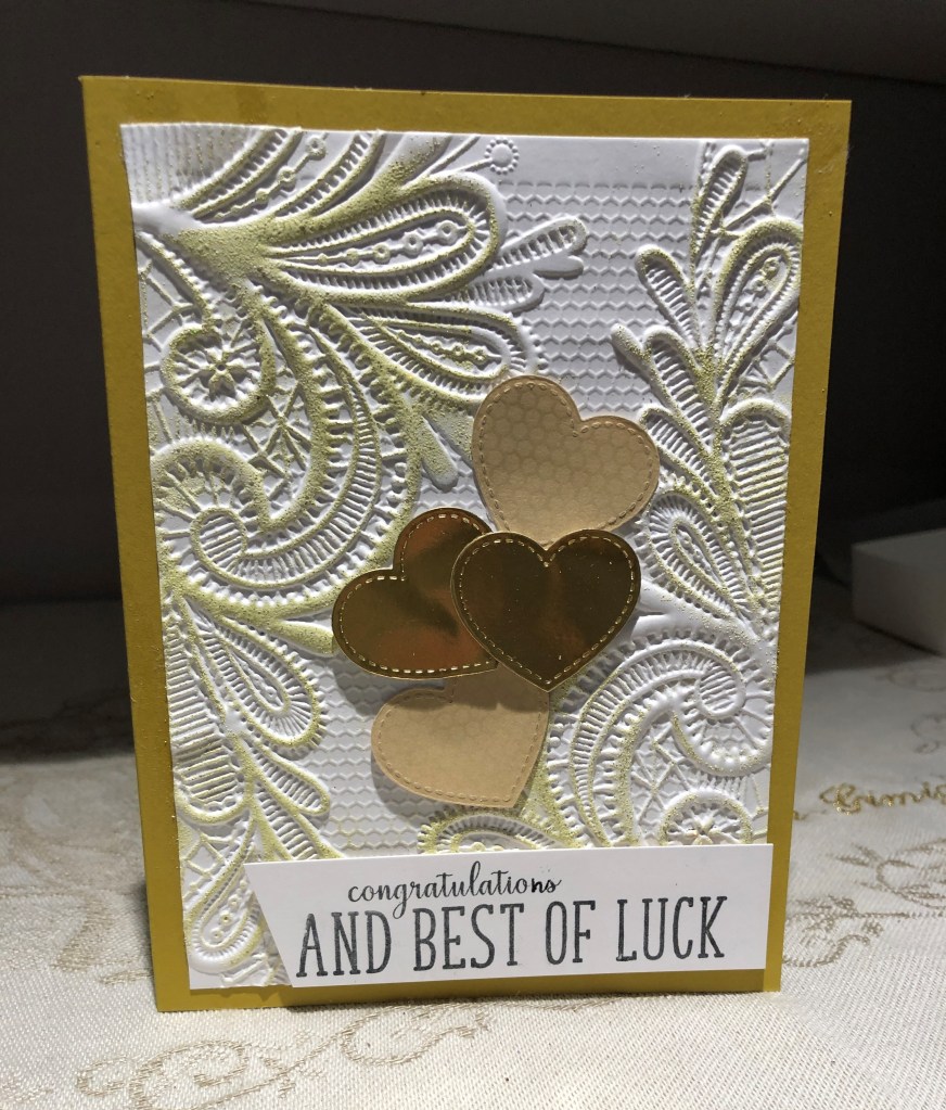 The folder came with my Gemini and I loved the 3D effect that it gave. Using my new Ranger powder in lemon drop after I’d swiped the Versamark ink over the raised parts I heat set. I cut this piece down a bit but it is a larger card than I usually make. Decided to add some hearts on top and the sentiment is a GKD set called Grand Greetings. Figure this card could be for a wedding or engagement as I’m sure someone will be heading to the alter at some point this year. I decided that trying to make this card work for more parts of the challenge would ruin it so stopped at the first part.