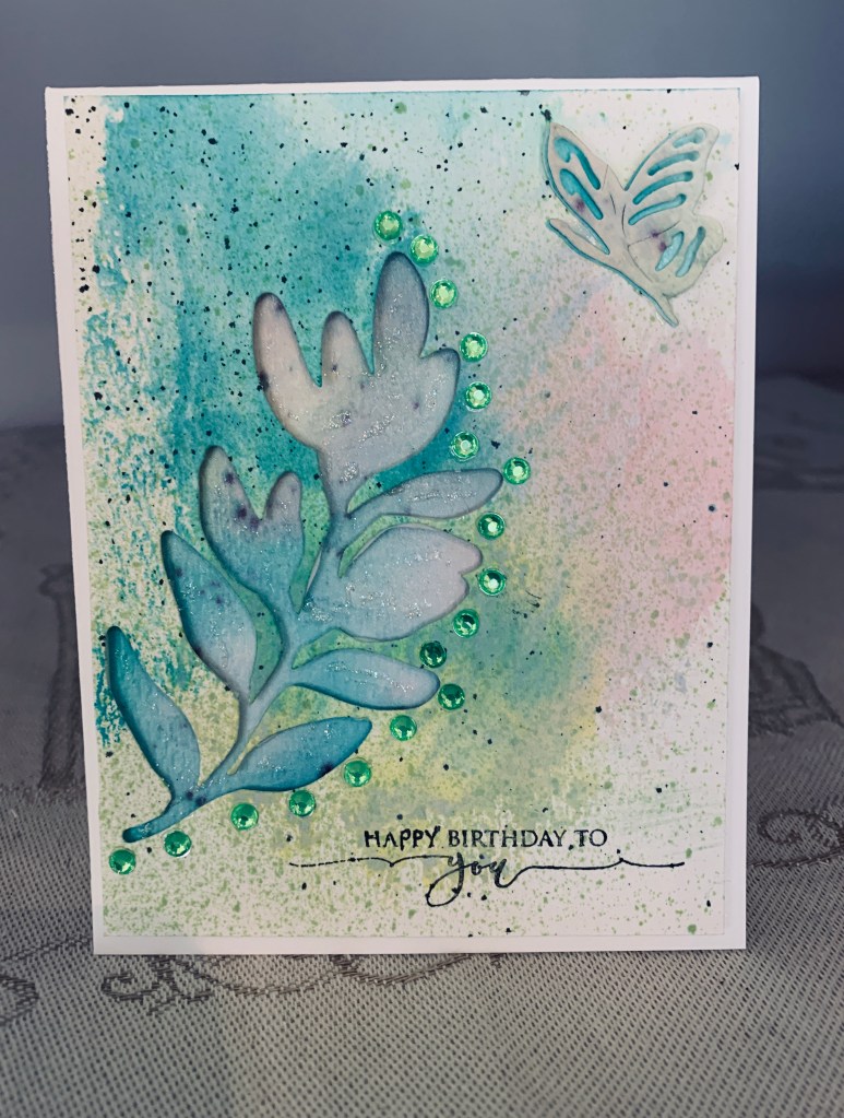 This is another of my water colour pieces and for this one I die cut the negative leaf shape added some dimensionals to the back and popped it up onto another water colour piece. Although it isn’t visible in the photo the part that shows through is very sparkly. I added a line of bling to emphasize the leaf shape and a die cut butterfly (Altenew). Sentiment is from GKD and the leaf die cut is from SSS. I’ve used the positive die cut leaf on another card which I’ll probably post tomorrow.