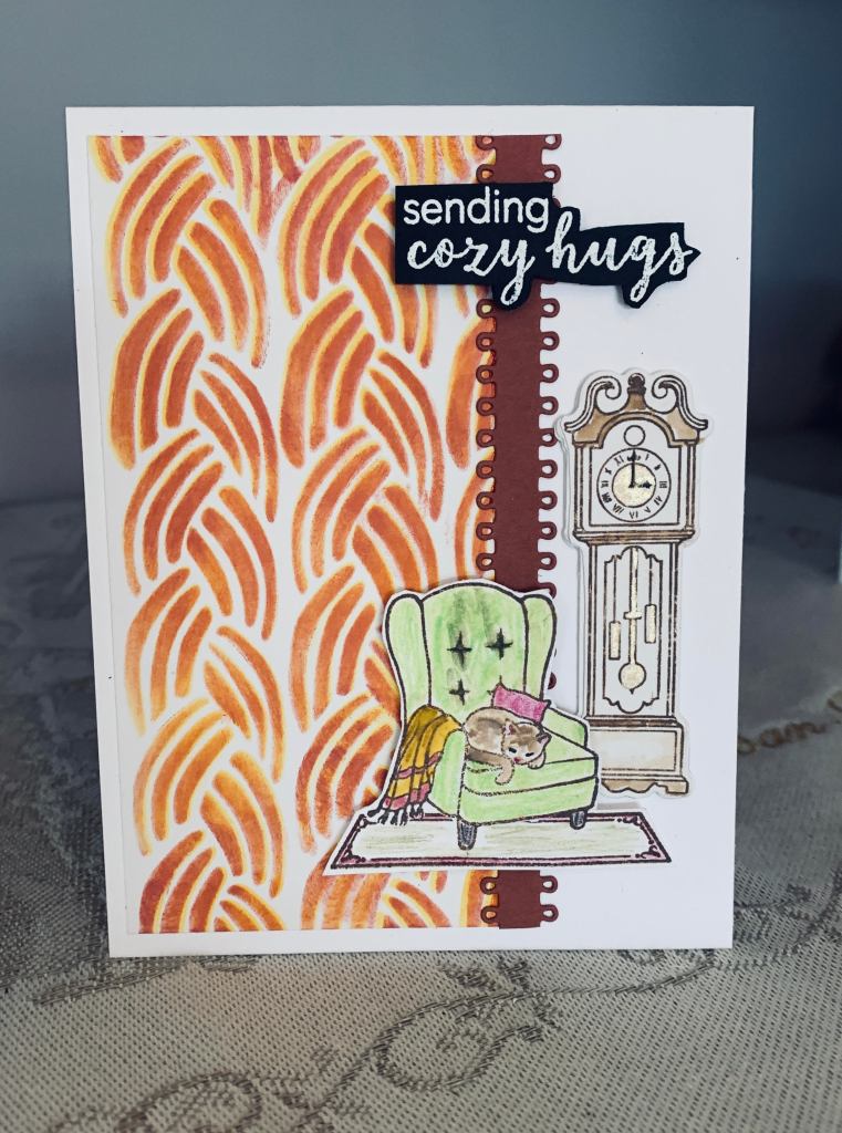That is definitely a cozy and comforting card. Love the stencil. It reminds me of part of the pattern in the fisherman’s afghan my mom made me many years ago.