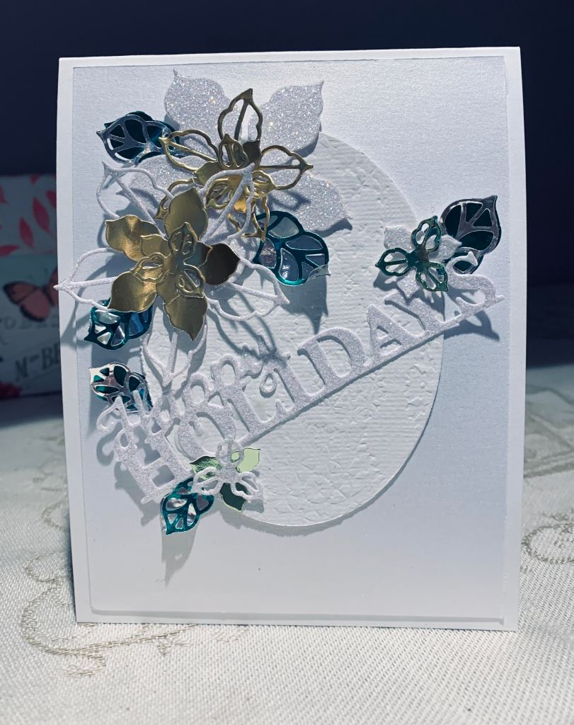 I added a silvery layer to the card front and then added the die cut oval which already had some texture and I added a bit more by dry embossing a few snowflakes. I popped this up on top of the silver panel. I spent some time die cutting all the elements for the poinsettias using a scrap piece of white sparkle, gold foil, silver foil and some green foil. After layering all the pieces I played around until I got them in position and then glued them on top. Added the leaves and smaller flowers around the sentiment. Die cut the sentiment from Essentials in the same sparkle cs. In retrospect I should have die cut one in a dark cs (maybe the green foil) to add behind the sparkle, but even so I’m happy with the end result. Not a card for mailing but I can hand deliver to my neighbor who I know will like it.