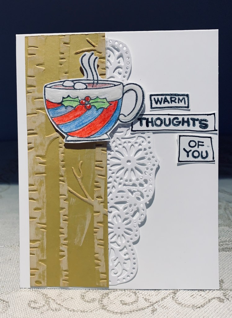 1. Great take on the sketch and color challenge. Who wouldn’t want a cup of hot chocolate after a walk in the wood? Great coloring on your cup and the lacy doily border die fits your theme.