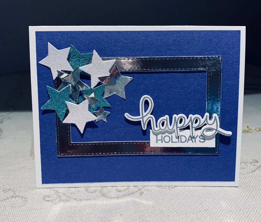I made this card last week but hadn’t yet posted it. After seeing that it fit the new challenge at Inkspirational I decided to post it now. It was inspired by a card I had seen but cannot now find a link to and the designer had used leaves whereas I decided to use stars. Basically I die cut stars from various scrap pieces using 2 different dies along with one tiny one. The frame is from a PaperRose stitched rectangle set. The sentiment is from LawnFawn. Once the frame was cut I added it to the dark blue piece and then onto the card front. I heat embossed the sentiment and die cut the word several times to make it thicker. Played with placement to ensure I could get the stars and sentiment to work together and then glued it all as shown. I’m pretty happy with end result and my hubby thinks it is great.