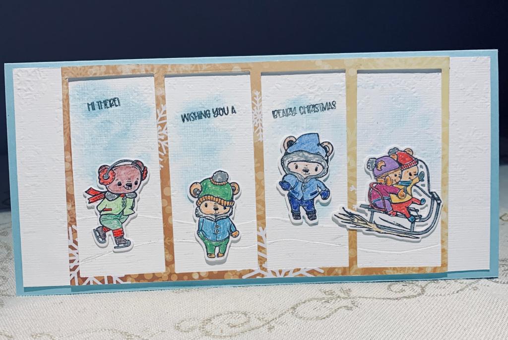 My Christmas gift from my hubby this year, was the latest Divinity Designs kit, and I just had to play with it right away. The frame used here is actually a piece left over after cutting out some PP for another card using the set. See following images. After dry embossing the white piece using a snowflake pattern, I laid the frame on top and added a bit of inking to denote some sky. I popped up the frame slightly by using some tiny pieces of foam tape around the edges. I also added some curved CS to look like snow banks at the bottom before adding the frame. Using the stamp set and my misti I stamped all the images and then hand coloured using pencils and some Sakura pens. I then die cut them out with the matching dies. I popped these up on top of the snow banks as you see in the picture. I used 3 of the sentiment stamps and stamped across the first 3 panels. There is glitter on all of it and the snowbanks show up more in R.L. than they do on the photo. I did think I might save these designs to add to my blog later this year, but decided not to wait. Now I have 3 cards ready for next Christmas so a good start to the year for me.