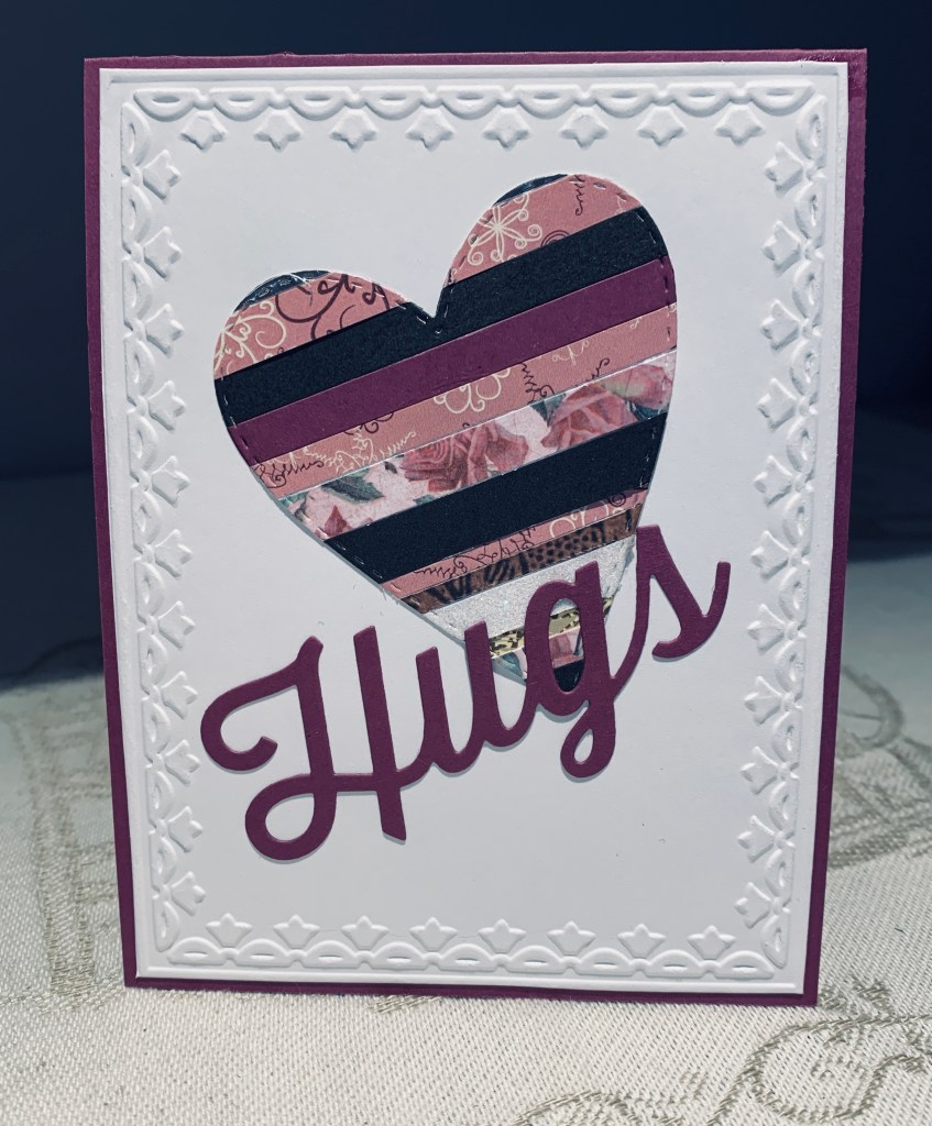 The previous post shows the negative die cut and this post shows how I used the positive piece. I used the same die set from Memory Box as mentioned in another post today. I also used a StampinUp EF on the white layer before adding the heart to that. Added these layers to the card front. Then I used another of my new MFT dies to cut out the word hugs and added that on top of the rest. There is a touch of shimmer to the word that can’t be seen here. Considering how much time I had available yesterday I think I used it very well completing 4 cards by keeping them fairly simple so I could do them quickly.