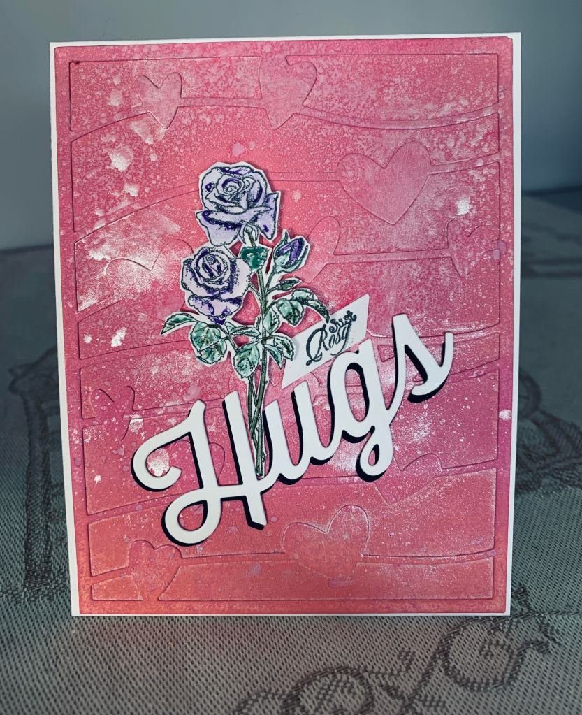 Perhaps roses are not quite spring flowers, but pink seems to remind me of spring and even Easter too. I started with an unnamed brand die cut done in white CS which I glued immediately to a piece of pink CS. Then I took several shades of Distress Inks in pinks and sponged colour over it all. I wasn’t completely happy with it so I used some spray inks and some Perfect Pearl shimmer to add more colour and spatter. All I wanted was for the background die cut to add texture initially. After adhering this panel to a card front I proceeded to stamp the flowers using a small stamp set from Hot off the Press, a tiny sentiment from the same set and I also die cut 2 hugs in both black and white. Those I glued together slightly offsetting the white over the black. I coloured the roses using Sakura glaze pens and fussy cut them out. Adding some foam tape to the back I placed them on the card front with the stems appearing to grow out of the word hugs. I added the tiny Just Rosy sentiment above the die cut word and underneath the leaves of the roses. I quite like the result and hope others do too.