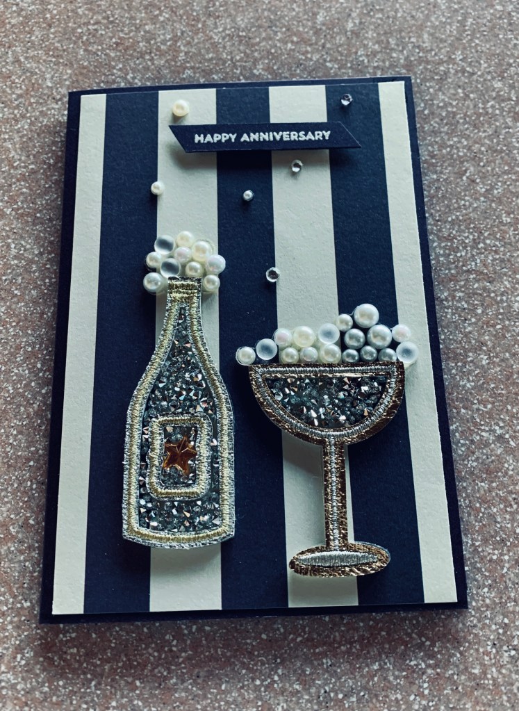 I should have begun with this post, Johanna, but I’m so happy that you are back making and creating your cards. At least you have temporary space to work. The card is awesome and love that you could use elements from a store bought card. The stripes behind your bubbly is perfect. Hugs.