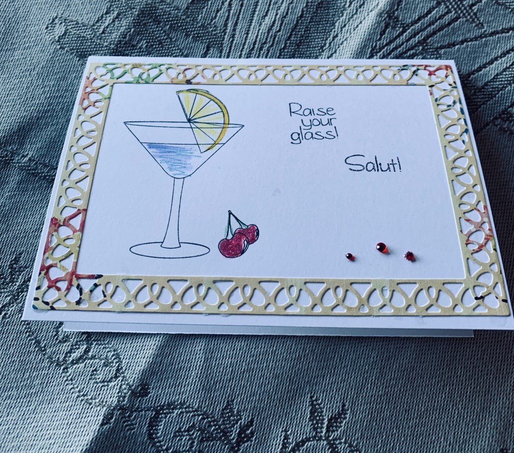 I had this frame leftover from a previous project which was part of the new die set by Recollections, and before it got lost in the mess of my desk I decided to use it. As well the stamp set is a new one that I hadn’t used yet, by Joy Clair Designs. It is one of the sets that was tied up in the border closure last year. This set seemed perfect for this challenge and I used the cherries and the lemon slice to meet the fruit requirement. I added some colour using InkTense pencils and then a Sakura glitter pen. Added the tiny gems but managed to keep it fairly CAS for a change.