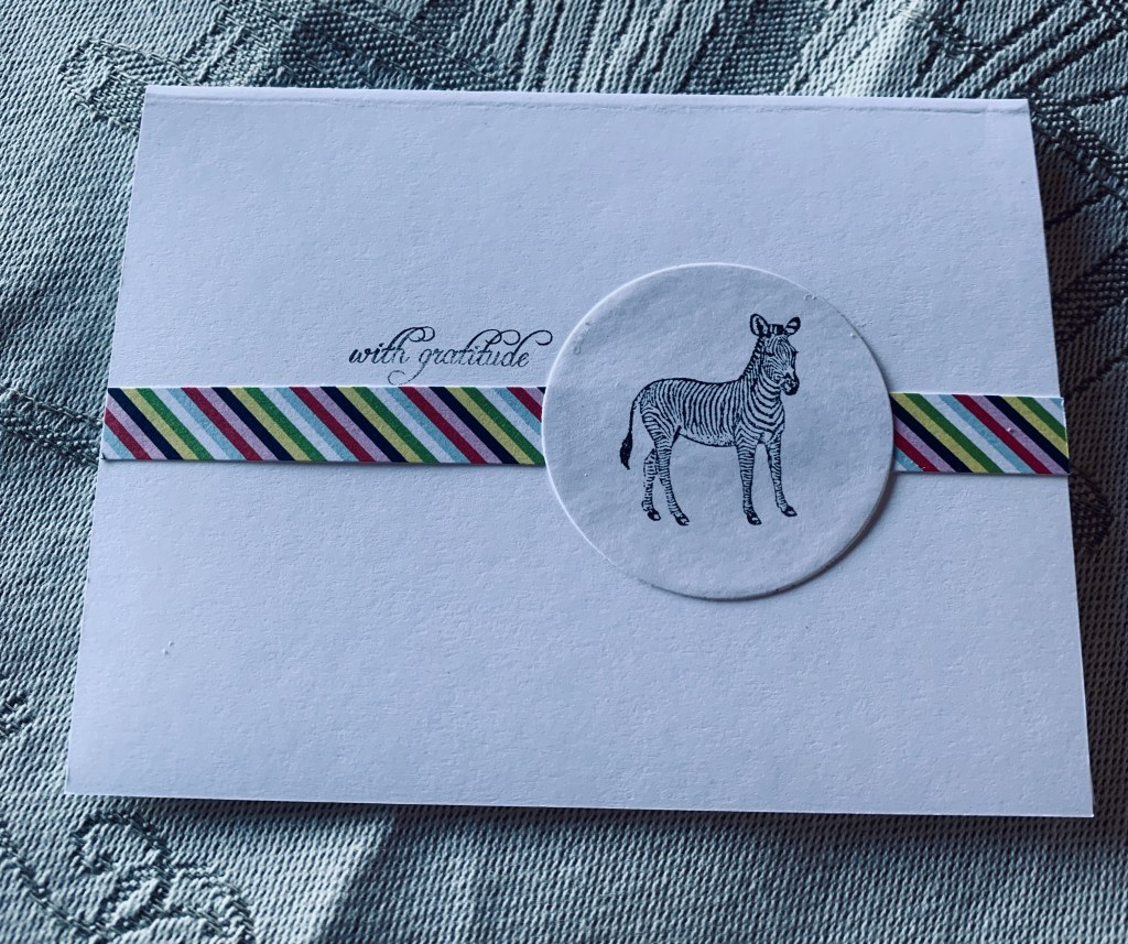 I keep looking at this card thinking it needs more, but it is a CAS card and if I add anything I’m sure to spoil it. As well it’s supposed to be one third or less so adding to it would negate that requirement. The zebra rubber stamp is ancient and is from Stamp Francisco. The sentiment was a gift in a purchased set from Kitchen Sink stamps. I don’t think I could get more CAS than this.