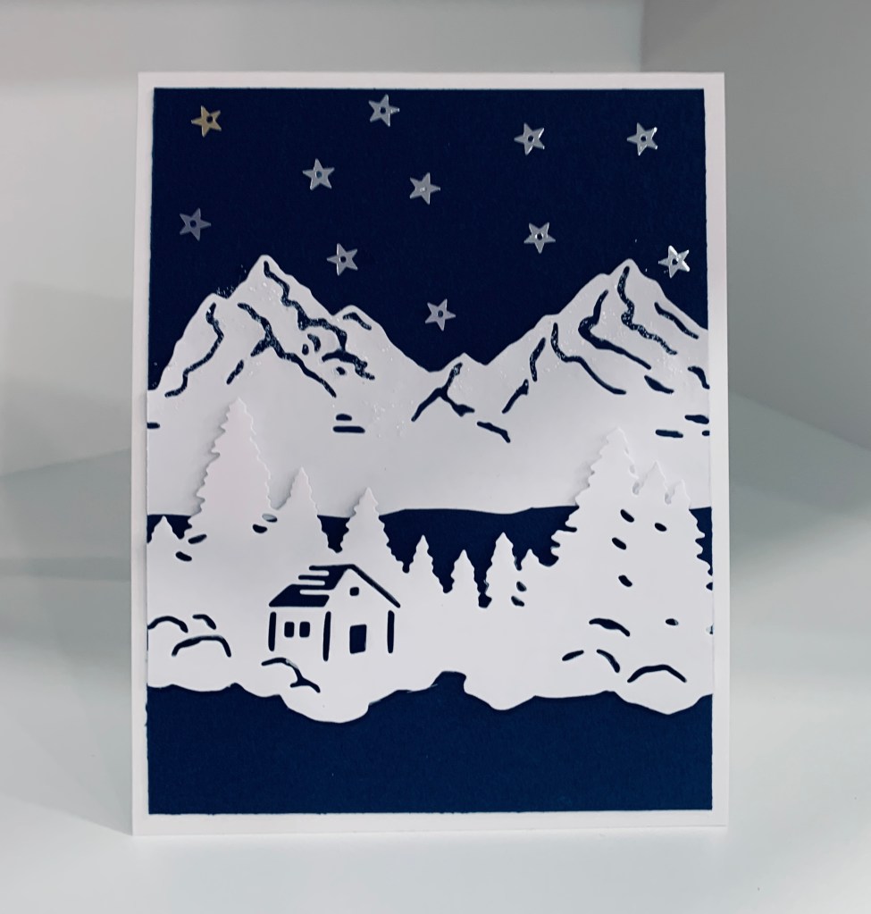 For a winter theme this card seems to fit the bill quite well. It has been done using a Hero Arts die set that I got about a year ago. I die cut the mountains and added them to the navy card front. I then die cut the cabin/tree piece and laid it in front of the mountains leaving the look of water in between. The bottom part of the card has been left blank so it looks like ocean and I added some sequin stars to the sky area. I also added some sparkle to the mountains but it doesn’t show up well on the photo. As yet I haven’t decided on a sentiment for this card.