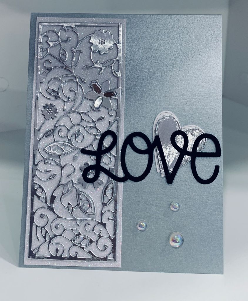 Doing a card in silver and white has been on my mind since Monday and I had several ideas on the go. Of course as I began things evolved a whole lot differently than what was in my head and I ended up making two cards that work for the challenge. The other one will follow this post later. I had initially cut out some small stitched hearts in silver and white from a set by Memory box, but they looked a bit blah so I had to think a little bit. Having a roll of silver plumbers tape on my desk I had the bright idea of adding it to some CS and either embossing it or die cutting. I opted for die cutting and used the panel die by Tattered Lace for this. Once it was cut I added it to some white sparkly CS from LawnFawn. (note to self – need to buy more). Using a metallic silver CS I cut two card bases and added this panel to the front of one. Then I added a white heart with a silver one offset on top to the side of the panel. The word die is from MFT and is called Loopy Love and as you can see I used black CS to cut it. The embellishments are Studio Katia iridescent bubbles and I found them when cleaning a drawer and they work perfectly for this card. As you know I am fond of elegant looking cards so I’m happy with this one.