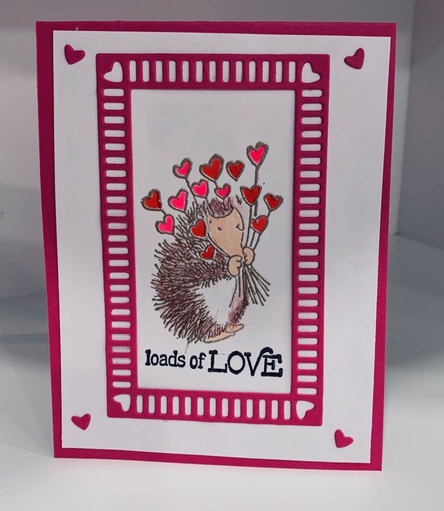 There are certain days, like Valentines Day and Halloween for example, that I simply can’t be bothered with, although I know for others they are really important. That said, I do make one or two cards for these occasions and this card is one of them. Stamps used are from Penny Black, the Die cut frame is by Recollections. I used Sakura Glaze pens to colour the hearts, Inktense pencils along with Ohuhu pens to colour the hedgehog. I also used the fallout hearts as embellishments. The image was stamped in VersaMark and heat embossed in Champagne from Recollections. Hubby came in when I was finishing this and said he thought it really cute. The pink CS makes it quite vibrant.
