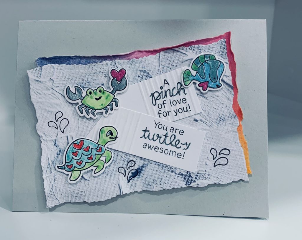 Johanna, this card is absolutely adorable! I love those fun sentiments and cute creatures. The way you did the 2 background pieces is perfect. I’m sorry you had a bad night, but I’m glad you found what you were looking for and got to create.
