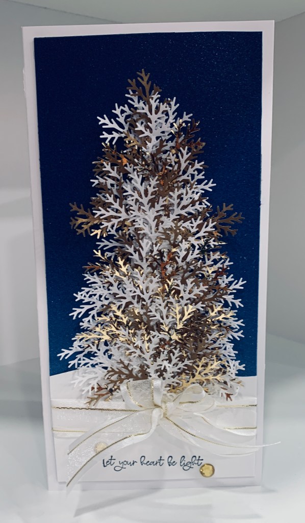 This card was inspired by the wreath, and the gold puppies. The products used are a mix from StampinUp (glitter background and sentiment) a Martha Stewart punch, ribbon from GKD and embellishments from my stash. I had seen something like this on Pinterest and liked the idea so this is my version. I used the punch to cut many sprigs in both white and gold and I glued them into a tree shape. Added a white curved piece to look like snow and to ground the tree. Not sure how this will mail so most likely I will hand deliver it to someone close by when the time comes. It was a bit time consuming to make, but very easy and the result is worth the effort.
