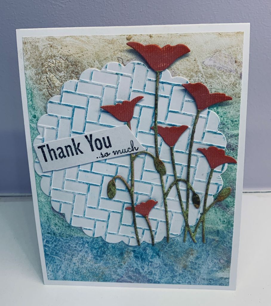 As I mentioned in my Mardi Gras post I had made a background from which I intended to die cut feathers, but the mineral paper wouldn’t cut. I decided to use it as a background here and in a couple of places you may see the edges of some embossed feathers, although the embossed circle does cover up a lot of it. For the embossed circle I used a folder called patio brick walk by Lifestyle Crafts. I used an ink pad directly over it very carefully to add a bit of colour. The sentiment is from an MFT set I’ve only had for a short time. And the poppies are an unbranded die. What I did was cut it twice, once in the orange PP and again in the green. Then I trimmed off the flowers from the green piece and carefully glued the 2 pieces together. I really like how it turned out doing it this way. I added a touch of ink to the buds before attaching it all to the card front. I meant to have this card work for two challenges but forgot an important element for the 2nd challenge so I shall have to do another for that one.