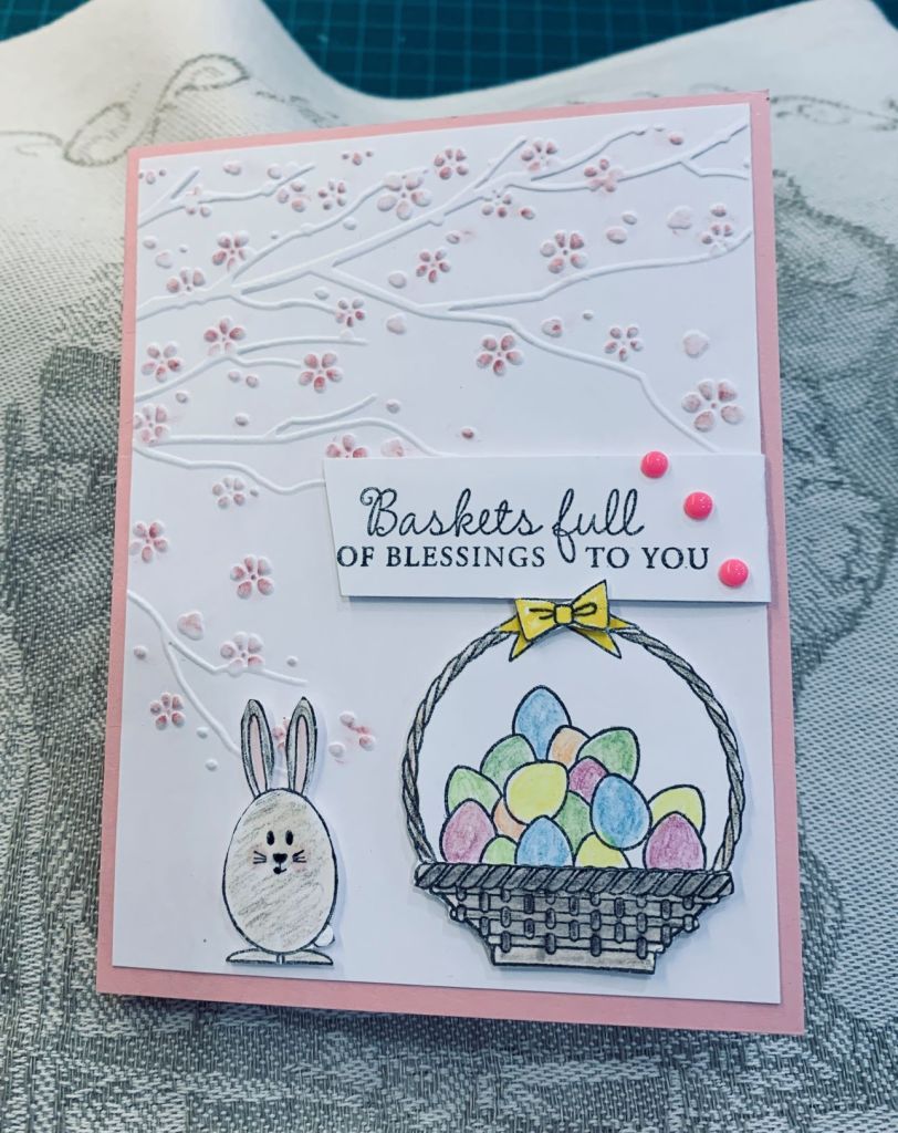 Really lovely Easter card. That’s such a pretty cherry blossom embossing folder. Love your basket of eggs and the fun bunny.