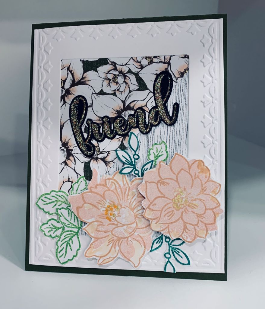 This embossed tulip frame layer by StampinUp has been sitting on my desk for a week or two. When I first made it, I wasn’t happy with it for the card I was then creating. I did cut it down a bit and also cut the middle part of the layer out too. Quite by accident the DSP angled piece ended up underneath the frame and I decided that was a good way to use the scrap DSP. I added a woodgrain piece at the bottom before making the flowers. The flowers and leaves are all from an Altenew stamp set and I used Distress oxides to stamp them. After fussy cutting them out I used some foam tape and then added them to the card front. The card front is the same green as you see in the DSP but looks black in the photo. The word was stamped and die cut from a GKD set called Stitched leaves and I added the embossed word to the black shadow before adding to the card. Rather than add any embellishments to this card I just added some sparkle to the flower centers. Thanks for looking.