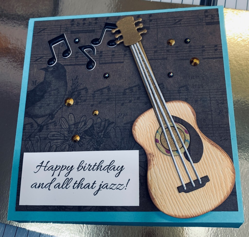 The idea for the card came from MFT and is basically a box shape that flattens for mailing. The PP is from a paper pad in my stash, the musical notes are stickers I’ve had for ages, the guitar is an unbranded die that came in two sizes and I used the larger one on this card, the sentiment is from GKD and the turntable is all from MFT. Once I had the box shape done, I added all the other elements until I was happy with it. Hope you like it and thanks for taking time to look.