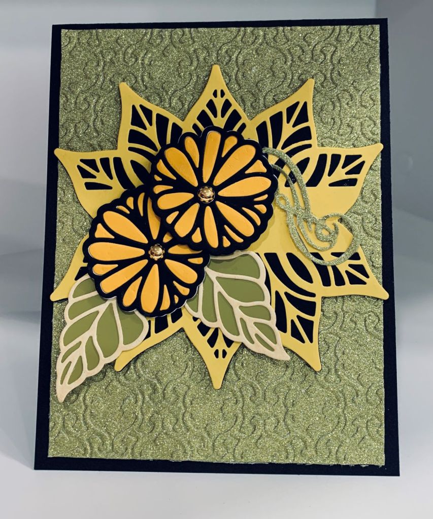 After going through my paper scraps I picked out several different shades of yellow and using a new Spellbinders die set called Be Leave Me, I proceeded to die cut the elements. I paper pieced the flowers to fit the challenge as well as adding the largest element to a black piece. I wanted some contrast between the flowers, leaves and background so I chose a cream yellow for the leaf outline and added it to a yellow green paint swatch. Using a glitter paper pad from Scrapbook.com I found a yellow green that works for the background and I dry embossed it using a brocade folder. I also cut a flourish from the same glitter pad and then added some gold gems for the center of the flowers. As I’m not sure yet of how I will use the card I’ve left off a sentiment and, in fact, may just add something inside rather than on the front.