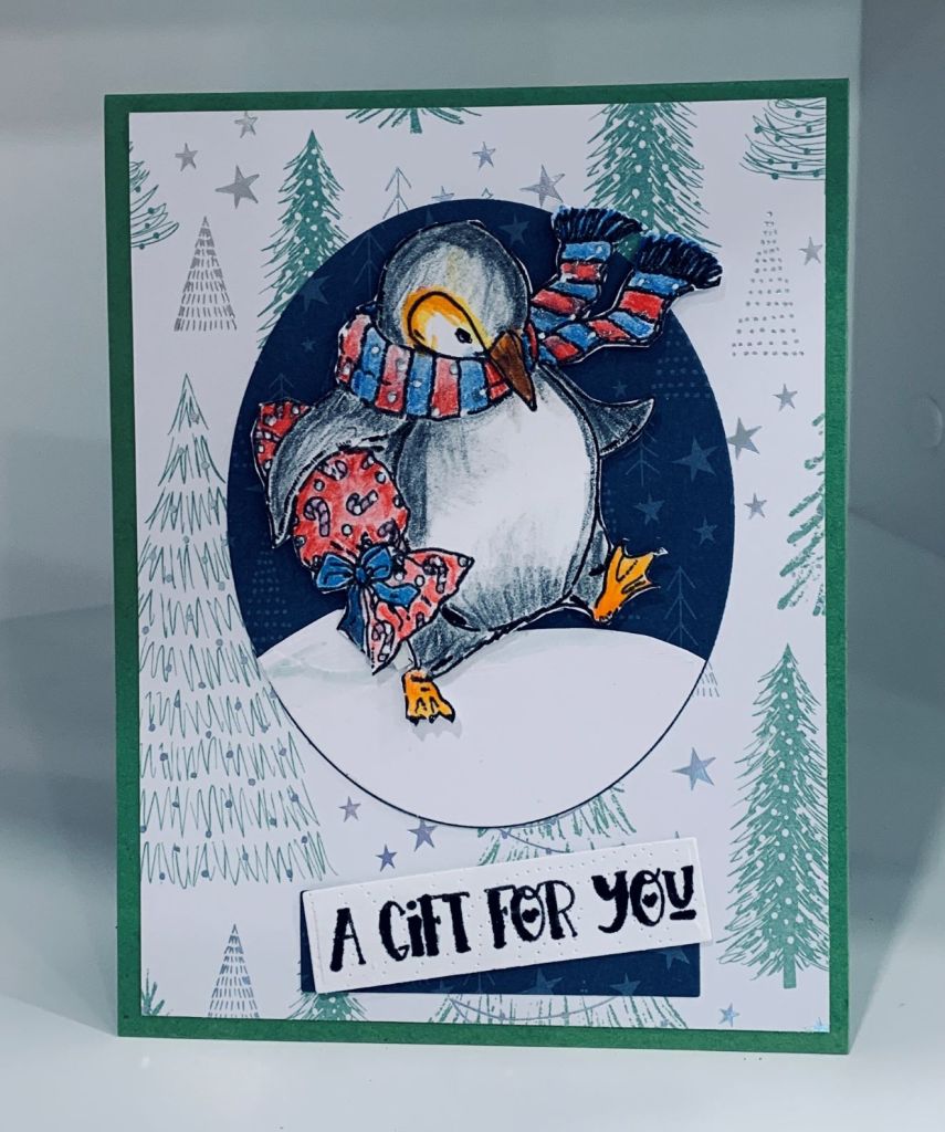 For this card I used the inspiration from the cute top left image and a few of the colours from the rest. My stamp is a new one from Penny Black called Waddling By and I stamped him several times in black and then with Versamark so I could heat set with clear powder. Then I coloured it using Inktense pencils and a some grays from Prisma colour. Once it was fussy cut I added foam tape ready for popping up. Using StampinUp DSP I cut the background piece and attached to card front and then from the same package chose the blue pattern and die cut using an oval die from Hero Arts. Using some scrap white CS I cut a shape to denote snow hills and added it to the oval before adding the penguin. I stamped the sentiment onto a scrap piece of white, leftover from a cover plate die cut and added a bit of black glitter pen to the heavier sections on the words. Die cut this with a small die from Creative Expressions and also another small one from the same blue piece as the oval. I offset the two for interest. I’m quite pleased with how this turned out and got it finished just prior to our next set of guests arrival. We have them for a couple of nights which is fun. Thanks for looking and hope you all have a wonderful day.