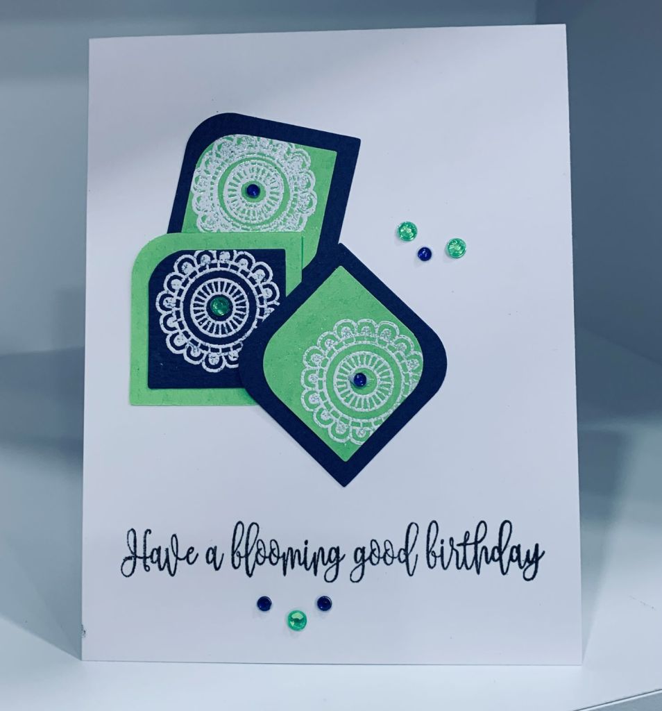 Navy and lime green go well together and I came up with this card. Happy birthday to the challenge blog. Adding it to the Seize the Birthday challenge as well. Inspiration came from a photo seen on Pinterest but mine is quite different to what I saw. Using up some scrap card stock I die cut some squares and then rounded the corners in two places. I did the same with the lime green paper. Stamps used are from GKD and were 2 different sets. Mandala shape was stamped onto the smaller pieces in white and then heat embossed with more white. I put the pieces together as shown and then added them to the card front. Sentiment was stamped at bottom of the card and then I added a few gems in the same colours. I like the simplicity of this card and the colours make it effective to my eyes. Hope you all have a great weekend. Ours is shaping up to be busy but fun.