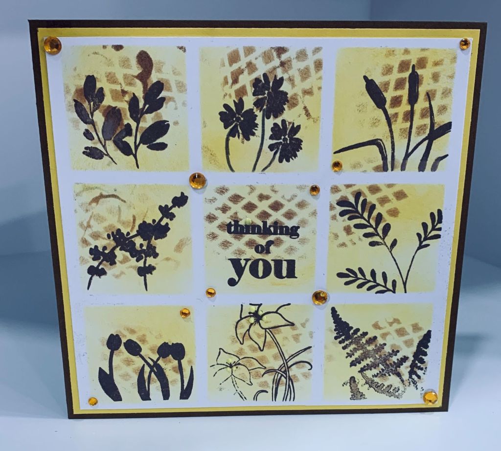 1. Thanks so much. I thought about doing a repeat of one or two images initially and then thought why not do a different one in each square. Some unused or less used stamps get inked this way.