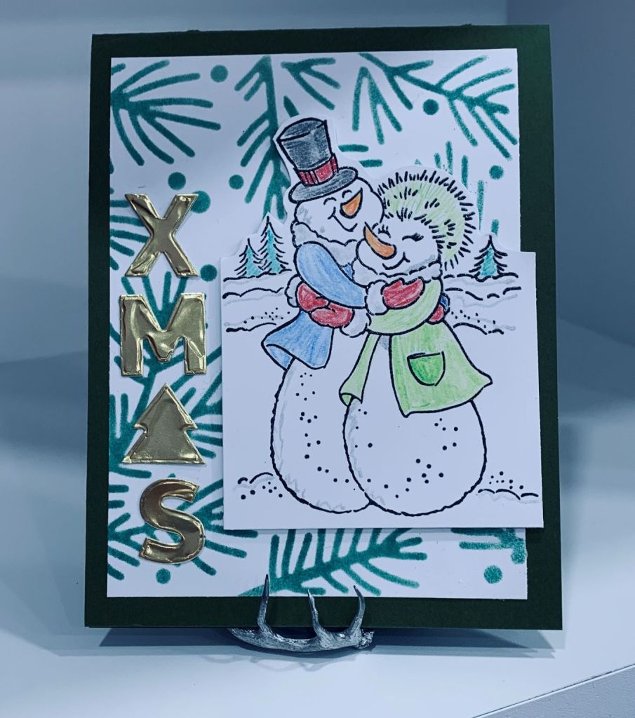 Considering that I wasn’t overwhelmed by my previous stenciling attempt I decided to try again and this one I quite like. Although it isn’t in Halloween colours it still works for the challenge and it also works for the Peace on Earth one as well. The background was stenciled in Pine Needles ink and used a stencil called pine leaves by Vicki Boutin. It is a larger size stencil so I have another small piece that can be used on a different card later. While it was drying I stamped the snow couple using a new Stampendous Cling rubber stamp and then I coloured them using Inktense pencils and a Sakura pen. The word was cut using a die set by MFT also new although purchased earlier in the year. It leaves a slightly puffy look to the letters which I quite like. The stenciled layer was offset very slightly on the card front and then I fussy cut the top of the stamped image before layering it on top with words added to the side. I’m much happier with this attempt and having it work for 2 challenges is a bonus. Hope you like it too.