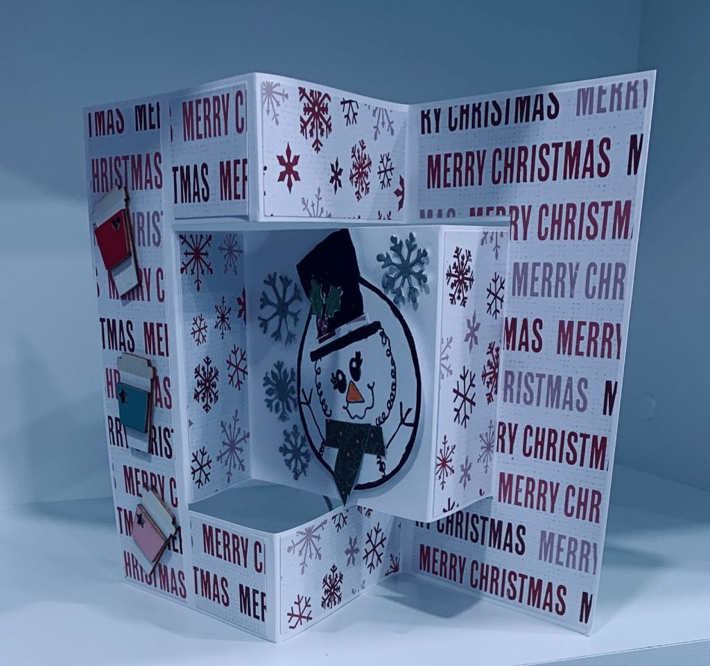 In searching for some cream coloured CS I came across a package of pre-folded card blanks that I had forgotten about. Actually when I purchased them my skill set was not that great and I couldn’t figure out how to add the PP properly, so I just put them aside and didn’t use them. At the same time I also found the little coffee cups, another embellishment that got lost in a drawer. These cups are made of wood. The snowman is my take on a Woodware stamp I had seen but not purchased. I liked it so decided to have a go at drawing my own version. It is quite similar to the actual stamp but not an actual copy as that would be infringing on someone else’s art work. I did use some stamps as my drawing skills are limited. The face is from MayMay and is made up from several in a set. The holly on the hat is from a very old Dare to be Artsy set and I added a paper hat band and scarf. I also used a black Spectrum Noir glitter brush to give sparkle although the photo doesn’t show it. The little snowflakes are fall outs from a border frame die by Papertrey and I used silver glitter on these. Paper is from a Recollections pad. This card is definitely wintery but looks a lot warmer than our current outside conditions.