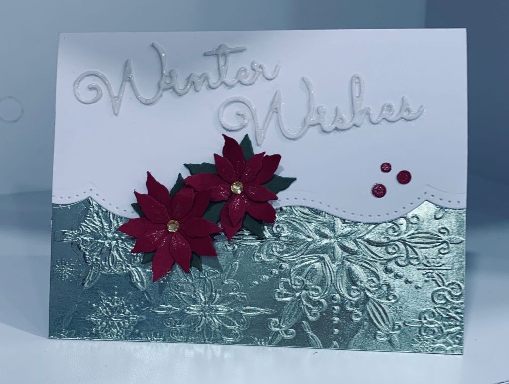 Very elegant in design and colors. The bracket die looks wonderful with the shiny embossed panel of snowflakes. Love the dark red poinsettias, too.