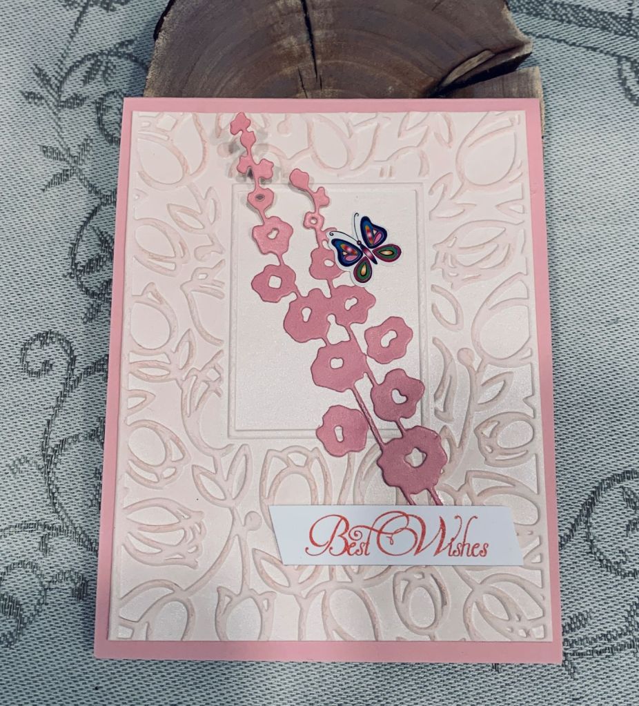 In spite of spending most of today coughing and spluttering, I really wanted to get this card into the challenge. I had almost finished it yesterday but it needed a sentiment and I decided to add one and upload it before heading back to my bed. I chose an older folder that is basically a tulip frame by Crafts Too and once it was embossed I went over the raised parts with some Tattered Lace using a sponge. I did think about cutting out the center section but decided to leave it and instead I added the hollyhocks. These were cut with an unbranded die. The butterfly is a small sticker and the sentiment comes from a Joy Clair set. It is a very simple card, but with the softness of the colours is quite pretty and my hubby has asked me to make another one without the other pieces so he can use it for photography. I guess the frame can be considered as meeting the challenge twist of borders.