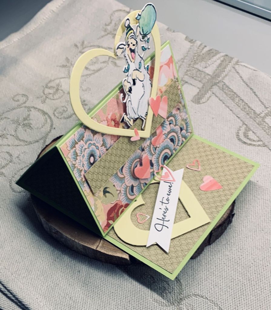 At Cardz 4 Galz the challenge is to make an easel card and this is my version. The paper I’ve used is from Close to my Heart and I’ve had it for a long time. The stamp set is from A.I., the bigger hearts were cut using Hero Arts Infinity dies and the smaller ones from a die that I have no name for, but I think it maybe Sizzix. The card stock is cut at 5″ by 11″ and then scored and folded to get what you see here. Once the PP was added it was easy to pop up various elements to get the end result. I love this stamp set as it is such a fun one. I also have a similar with Panda’s and they allow for some amusing cards. It isn’t too bulky for mailing and of course folds nice and flat.