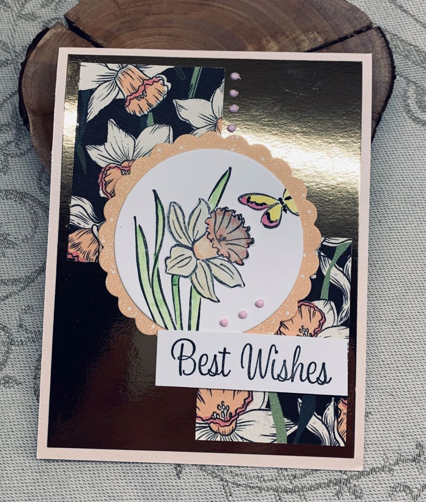 It took me ages to decide on what to do for this challenge and several ideas didn’t pan out at all. Not really in the right frame of mind for this particular one I guess. Anyway I eventually settled on using up some of my daffodil PP and added two pieces to the gold foil background. I had the die cut circle from other projects so using the daffodil daydream set from StampinUP I stamped the smaller of the two daffodil stamps along with a partial butterfly. I coloured in the flower and butterfly with Oxide inks and then messed up the center of the flower. After some colourful language I decided to re-stamp the flower, colour it and fussy cut it so I could add it over the top of the other one. I actually like it better so the error was, in a way, a good thing to do. To give the circle a bit of pizzazz I added some scalloped PP behind it that coordinates with the other PP. Once it was added to the card front I finished it with a few Pops of Color dots and a nice sentiment (from Hampton Art).