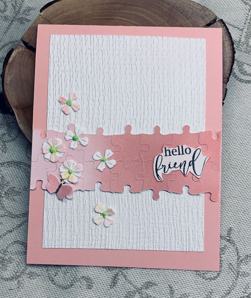 The puzzle strip hadn’t been fully glued down around the edges so I carefully cut off the messed up top and bottom part and basically started over. The two small flowers floating above and below the puzzle piece were easy to remove from the messed up panel so I was able to use them again as shown here. I also used a tiny fussy cut butterfly to cover up another area. Flowers are a die from Memory Box called Layered Impatiens. Sentiment is from a GKD incentive set and was fussy cut so it would be small. I doubled up a few of the flowers after adding a hint of pink to them. I hadn’t intended to use any dry embossing in my original idea but decided to add it to this version and the folder is from Tim Holtz. I can’t remember where the puzzle die is from and I sponged 3 different pinks over a panel before die cutting. Inks are Distress Oxides, Spun Sugar, Victorian Velvet and Worn Lipstick.