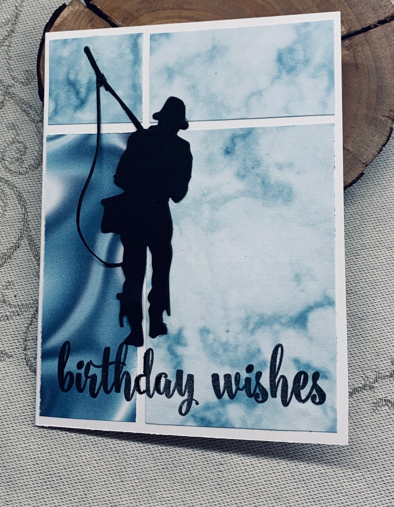 After gathering up the necessary items to make the card, I set my timer and off I went. First step was cutting the DSP which is from Stamping up. Second step was to die cut the fisherman out of black card stock and I used a new die from Kokorosa to do this. Once this was done I glued each piece of DSP down as you see, stamped the sentiment from GKD at the bottom and glued the fisherman so he appears to be standing on the letters. He wouldn’t stay glued – honestly this new glue has to be the worst I’ve ever purchased and I am at the point of chucking it because it is so bad. I shall empty the bottle and refill it with my usual brand as the nozzle on this bad one is the only thing good about it.