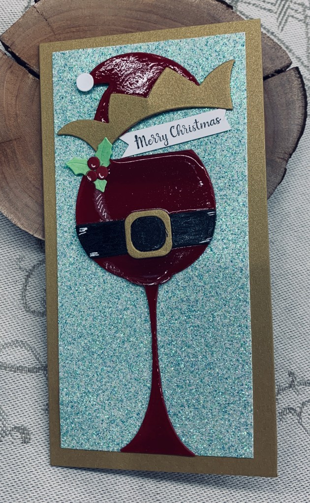 I began by cutting all the pieces for the card using a red CS for the glass and hat and an old gold CS for the hat trim and the card base along with some scrap pieces for the belt etc. Once I had it all cut I assembled the glass and then added Nuvo Crystal to the entire piece including the hat. I left it to dry and while drying I put together the holly and berries and the belt to which I also added Sakura glaze to give it some texture. When everything was fully dry I added some white glaze here and there for definition and shading. Added the glass and hat to the glitter CS and then to the card front. It is quite sparkly in reality and very shiny too.