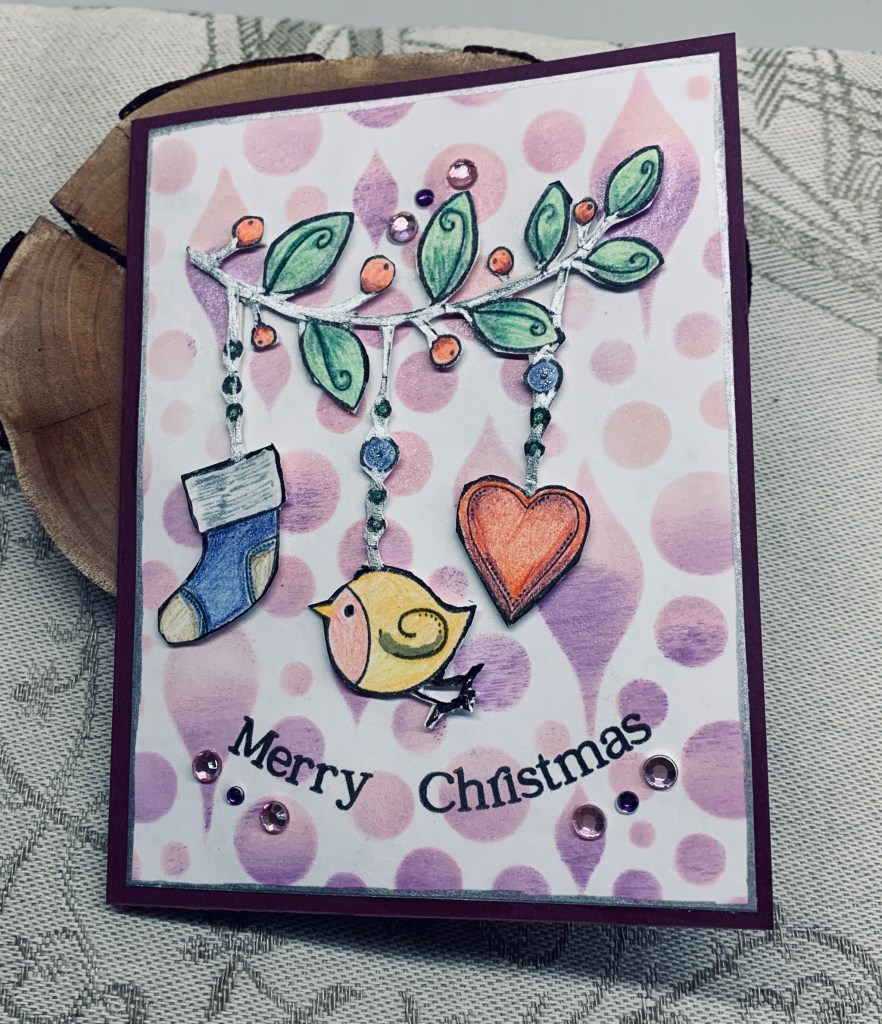 Fabulous card from the stenciled background to the tree bough with the hanging ornaments. Love it!