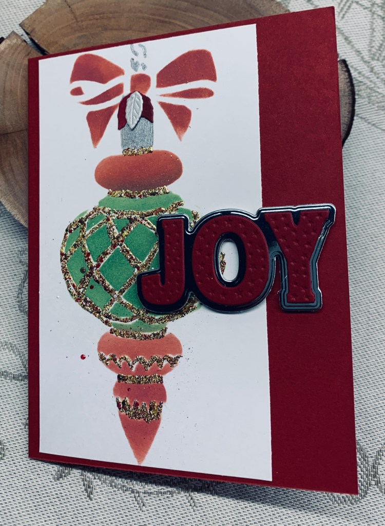 This image is a Kaisercraft stencil from a set I got at a long ago card crafting day in a local store. I made it weeks ago and hadn’t decided how I wanted to use it so it sat on my desk. Because of its size I wasn’t sure if I wanted to make a smaller slimline or keep to my regular size card. In the end I cut it down so it would fit onto a regular card front because it seemed to work best for the challenge at As you See It. It also fits the anything goes Peace on Earth challenge too. Once the ink had dried after stenciling I went over the lines with an embossing pen and added in the Cosmic Shimmer gold embossing powder which also has some red dots in it. This powder gives it all subtle sheen as well as dimension. I used a silver pen to complete the chain and the hanging portion of the bauble. The die is a new one from Scrapbook.com and is in two parts so I used mirror card for the back and red for the rest.