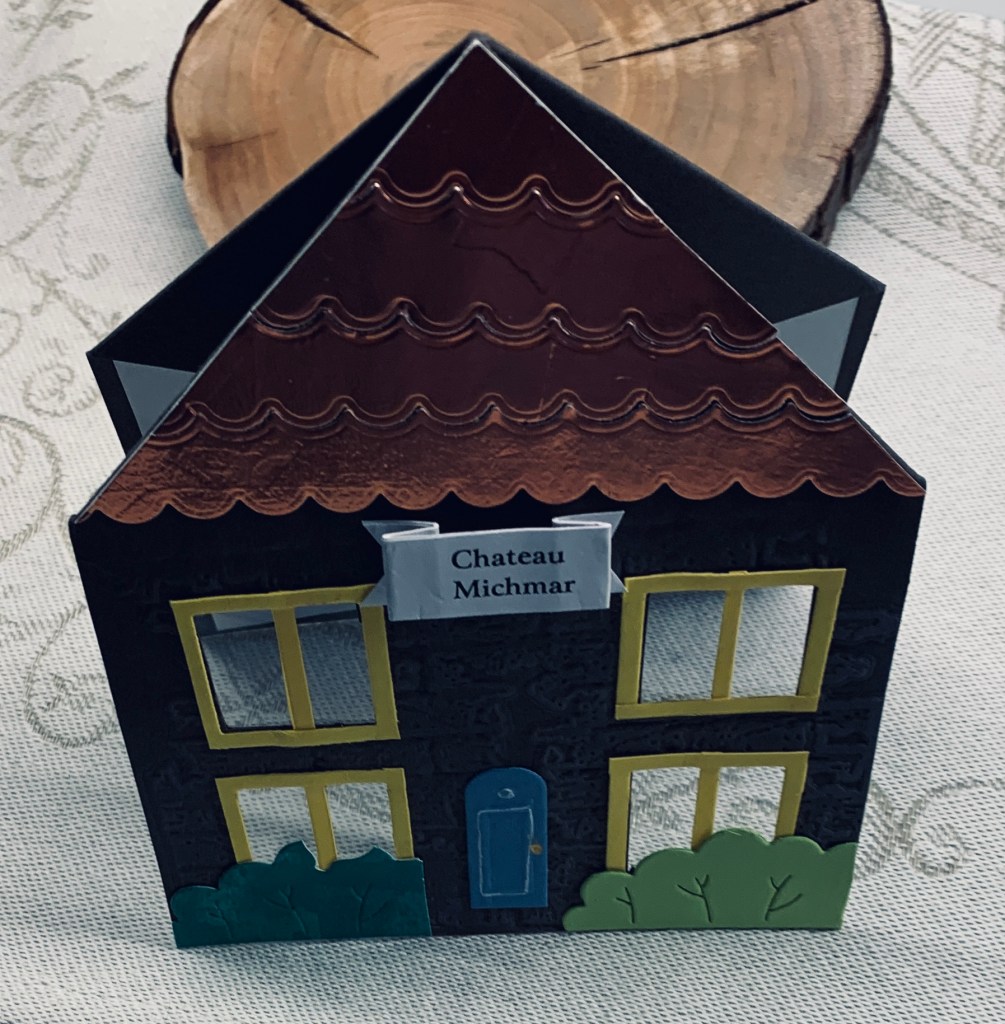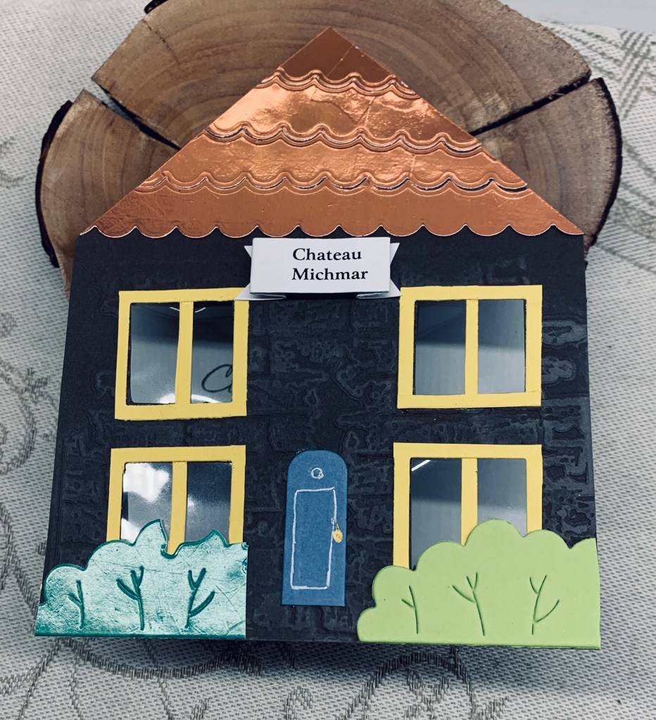 A friend requested a new home card and this is what I came up with for him. The little banner was part of his request as he wanted his niece’s nickname on the house. I did a bit of research to see what was out there and found this fun fold. As I don’t have any of the dies that the person showing the fold had and I don’t have much in the way of new home stamps and dies, I basically created this by hand. To do the windows I used a scrap piece of yellow CS and a window die that cuts 9 windows. I then cut the whole thing up so I could have window frames but I did have to glue some bits together to get the center piece down the middle. I fussy cut the holes into the background CS and added the frames around the spaces. Before I did that I also used an EB folder from Sizzix, to give some brick texture on the card front and I added a small amount of ink here and there for a more realistic look. I have a new die set from Spellbinders that does modern ovals and I used the smallest one for the door and simply cut it to the length I needed. A little embossing on it for dimension and a white pen gives it a decent look Gold pen for the handle. I added some packaging behind the windows to make it look like a pane of glass and some MFT die cut bushes for underneath the lower windows. The added benefit here was they hid some poor cutting edges. For the roof I die cut some copper and used a border die from Heffy Doodle to cut the edge. I then tried to add the same border die in other places without cutting but it still cut through in places so I taped it all back together on the backside before gluing it on. The inside used a Kitchen Sink stamp set which is very old, I think I won it in a Mod Squad challenge, and I took 2 sentiments and added them together.