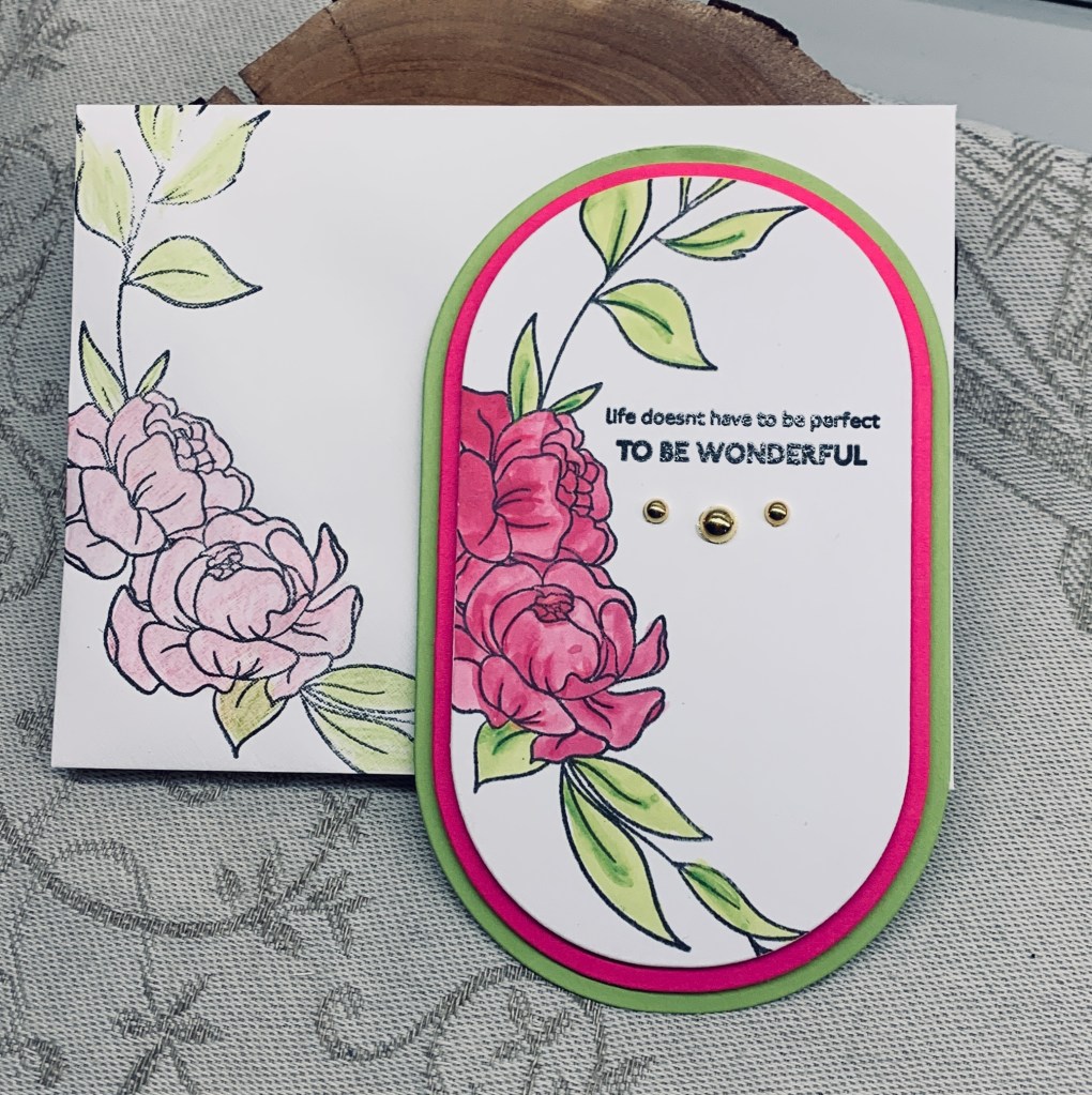 Inkspirational has a designers choice challenge and wants to see an envelope that matches the card and Seize the Birthday is asking for Lime Green and Hot Pink colours. Having a few new products to play with, I decided to combine the two challenges with one card. Firstly, I die cut card stock, from GKD, in the colours using my new Spellbinders Modern Oval dies. I graduated one die smaller each time. Each layer was popped up with foam tape. On the white oval I stamped the image using a new Altenew stamp set called Inspirational Quotes. I used one of the sentiment stamps from here too, heat setting it with clear embossing powder. Using Distress Oxide inks in Picked Raspberry and Twisted Citron I water coloured the image. Using some pencils in the same tones I added a bit more depth here and there. I added the same floral image on the linen envelope using only pencils to colour it, because I didn’t want to add water to the envelope. My embellishments are from Trinity Stamps.