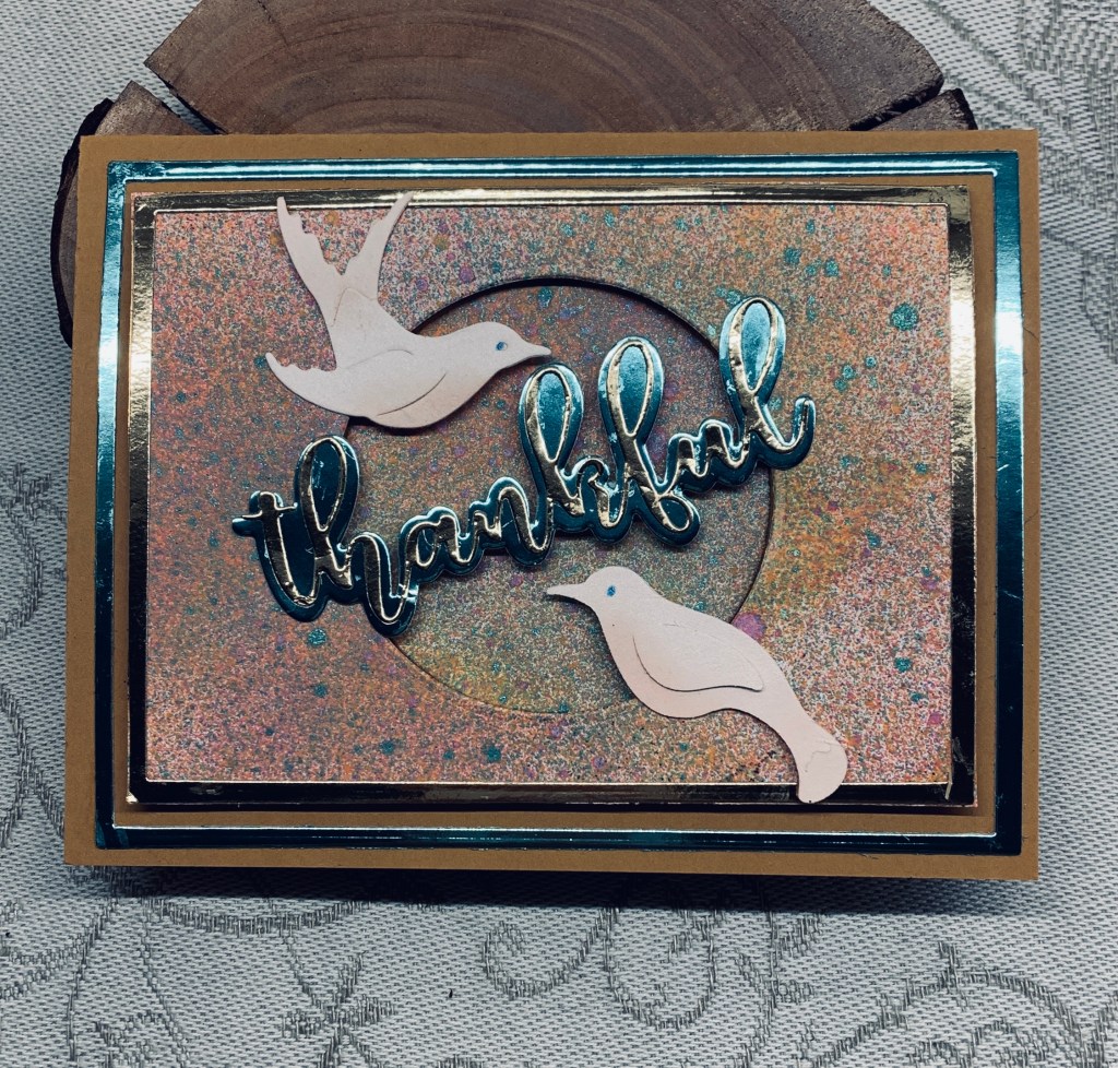 My card morphed as I was working on an idea partly because an edge I tried to create on my panel went badly wrong, which meant I had to cut the panel much smaller than intended. I began with a panel 4″ x 5 1/4″ in size and using Distress Oxide sprays I spritzed two colours over my piece and then added a few spots of Mica Spray on top. I wanted to use copper heat embossing around the edges but I dropped my embossing powder all over it making a huge mess. The mess was all over my cabinet top and inside the tray I use for embossing and took forever to clean up. I ended up cutting the panel down in size to get rid of the parts that were so ugly and used some infinity rectangle dies to cut a gold border and one similar in shade to the mica spray. I also die cut the center of the piece. After adding doubled up foam tape I attached the panel to the card front, added the blue/green frame around it and then added the die cut piece back inside. Using a small thankful die from a set by Gina K. I die cut the shadow in the blue/green mirror CS and the word in the gold attaching them together and then onto the card front as you see. The birds are from a very old Sizzix die and I sponged a bit of Tattered Rose along the breast and tails before adding them above and below the word. In the end not a bad card even though it wasn’t at all what I had in my head when I began.