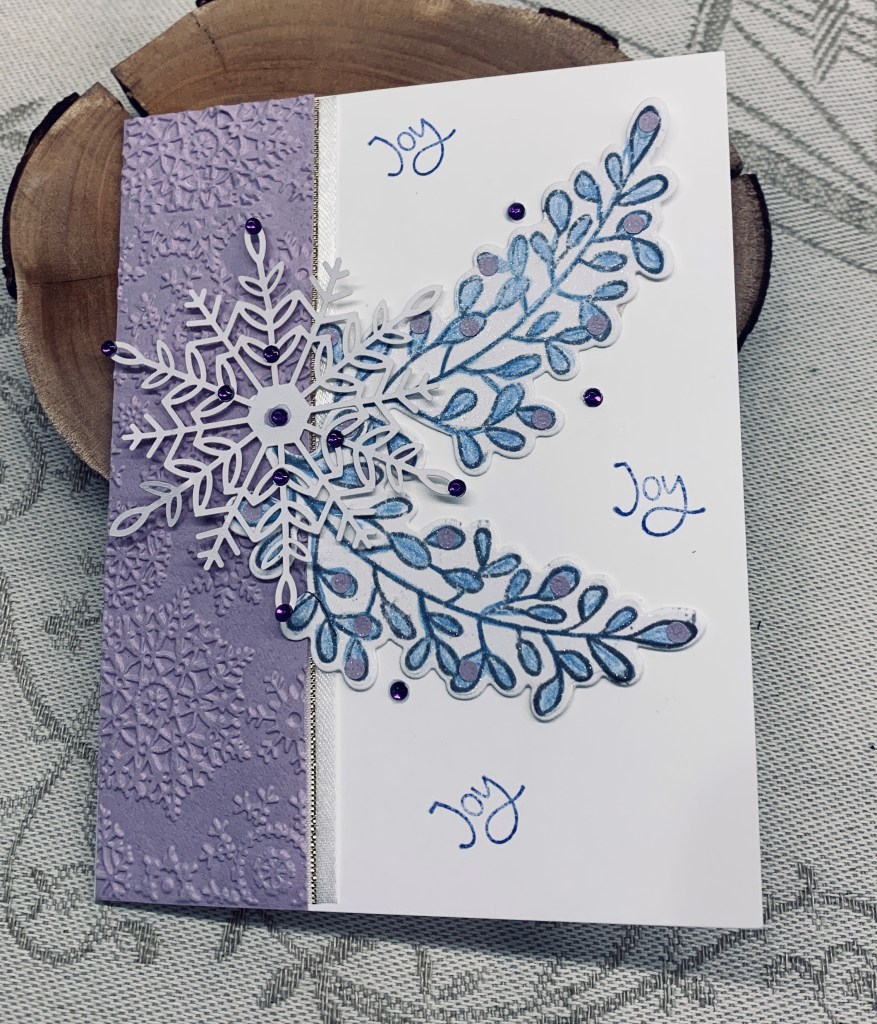 I almost missed this challenge, but remembered just in time. Taking a scrap piece of soft purple paper I dry embossed it with an old snowflake folder. I edged it with ribbon leaving only the gold edge showing from underneath and then added it to the card front. Using a Catherine Pooler stamp and die set I stamped 2 sets of leaves and die cut them. Then I used a Prisma Color light blue pencil for colouring the leaves and some tiny punched circles in purple for interest. After adding them as you see I included a StampinUp snowflake to which I added some purple gems. A few of the same scattered around the leaves and a repeat stamp of the word Joy (also a StampinUp product) and I considered the card complete.